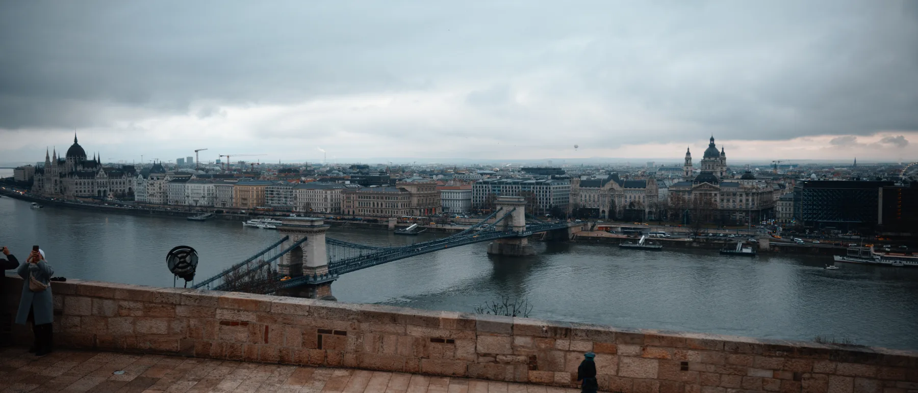 ドナウ川の片側には丘があり、もう片側にはまっすぐな道と建物の列が続いている。橋を渡ると街の見え方が変わり、同じ光でもまったく違う表情になる。